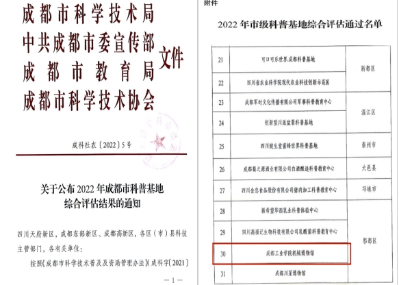 近日,接成都市科技局文件,学校机械博物馆顺利通过2022年成都市科普基地综合评估。